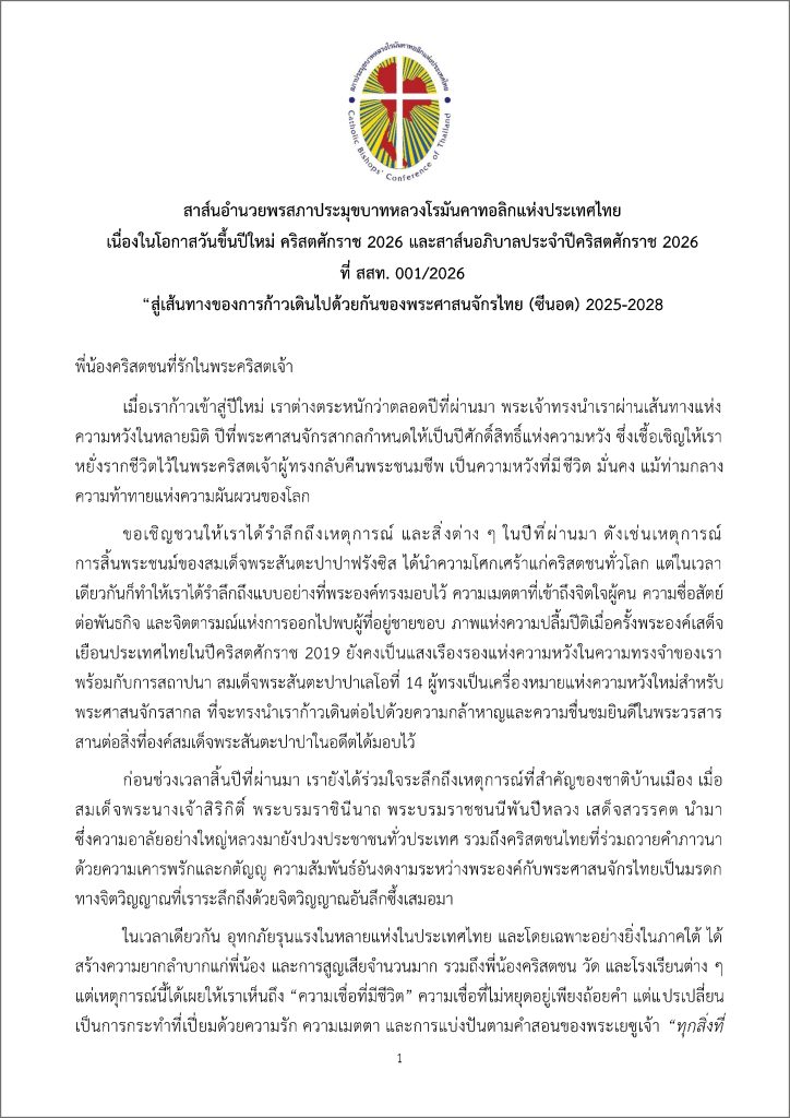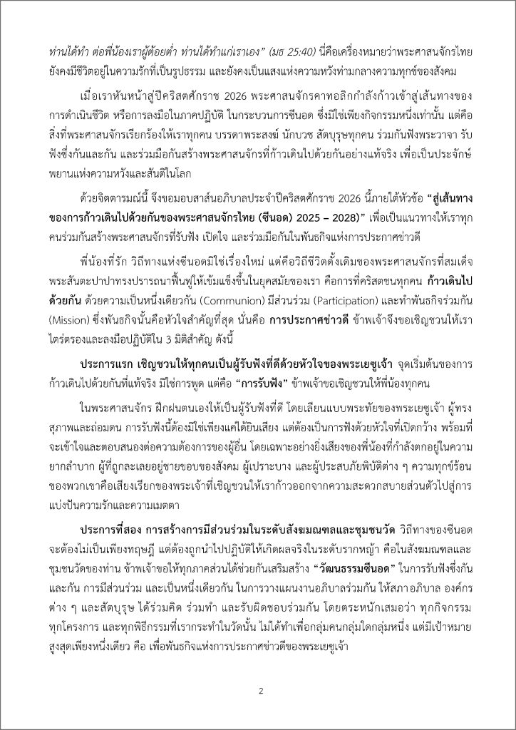 ด้วยจิตตารมณ์นี้ จึงขอมอบสาส์นอภิบาลประจำปีคริสตศักราช 2026 นี้ภายใต้หัวข้อ “สู่เส้นทางของการก้าวเดินไปด้วยกันของพระศาสนจักรไทย (ซีนอด) 2025 – 2028)” เพื่อเป็นแนวทางให้เราทุกคนร่วมกันสร้างพระศาสนจักรที่รับฟัง เปิดใจ และร่วมมือกันในพันธกิจแห่งการประกาศข่าวดี