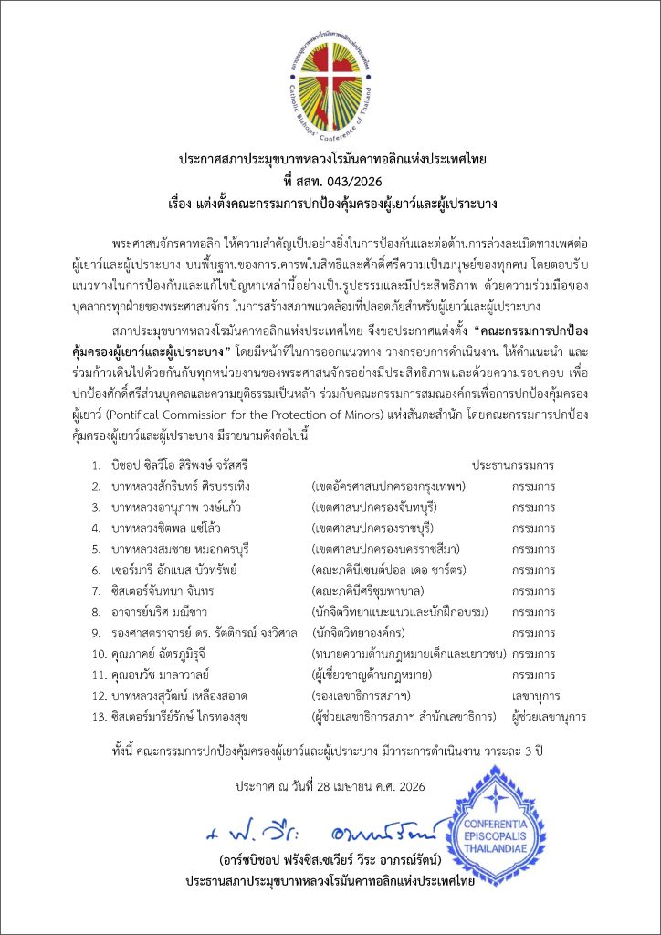 สภาประมุขบาทหลวงโรมันคาทอลิกแห่งประเทศไทย จึงขอประกาศแต่งตั้ง “คณะกรรมการปกป้องคุ้มครองผู้เยาว์และผู้เปราะบาง” โดยมีหน้าที่ในการออกแนวทาง วางกรอบการดำเนินงาน ให้คำแนะนำ และร่วมก้าวเดินไปด้วยกันกับทุกหน่วยงานของพระศาสนจักรอย่างมีประสิทธิภาพและด้วยความรอบคอบ เพื่อปกป้องศักดิ์ศรีส่วนบุคคลและความยุติธรรมเป็นหลัก ร่วมกับคณะกรรมการสมณองค์กรเพื่อการปกป้องคุ้มครองผู้เยาว์ (Pontifical Commission for the Protection of Minors) แห่งสันตะสำนัก โดยคณะกรรมการปกป้องคุ้มครองผู้เยาว์และผู้เปราะบาง มีรายนามดังต่อไปนี้