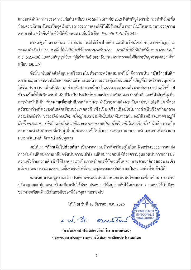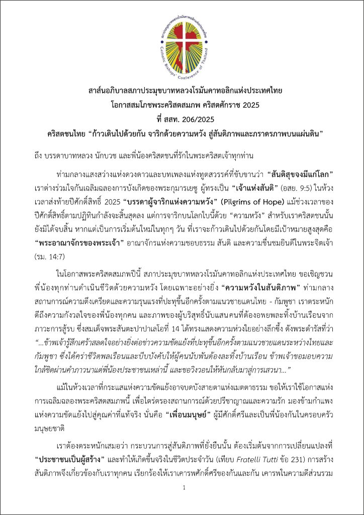 ในโอกาสพระคริสตสมภพปีนี้ สภาประมุขบาทหลวงโรมันคาทอลิกแห่งประเทศไทย ขอเชิญชวนพี่น้องทุกท่านดำเนินชีวิตด้วยความหวัง โดยเฉพาะอย่างยิ่ง “ความหวังในสันติภาพ” ท่ามกลางสถานการณ์ความตึงเครียดและความรุนแรงที่ปะทุขึ้นอีกครั้งตามแนวชายแดนไทย – กัมพูชา เราตระหนักดีถึงความกังวลใจของพี่น้องทุกคน และภาพของผู้บริสุทธิ์นับแสนคนที่ต้องอพยพละทิ้งบ้านเรือนจากภาวะการสู้รบ ซึ่งสมเด็จพระสันตะปาปาเลโอที่ 14 ได้ทรงแสดงความห่วงใยอย่างลึกซึ้ง ดังพระดำรัสที่ว่า “…ข้าพเจ้ารู้สึกเศร้าสลดใจอย่างยิ่งต่อข่าวความขัดแย้งที่ปะทุขึ้นอีกครั้งตามแนวชายแดนระหว่างไทยและกัมพูชา ซึ่งได้คร่าชีวิตพลเรือนและบีบบังคับให้ผู้คนนับพันต้องละทิ้งบ้านเรือน ข้าพเจ้าขอมอบความใกล้ชิดผ่านคำภาวนาแด่พี่น้องประชาชนเหล่านี้ และขอวิงวอนให้หันกลับมาสู่การเสวนา…”