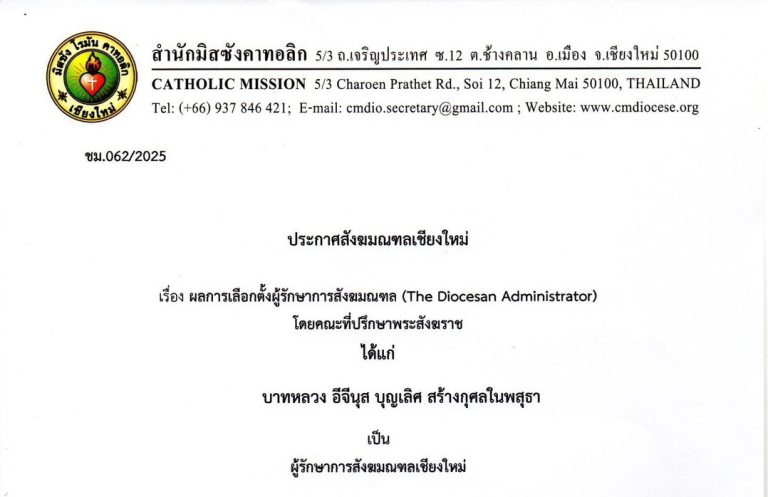 ประกาศสังฆมณฑลเชียงใหม่ เรื่อง ผลการเลือกตั้งผู้รักษาการสังผมณฑล (The Diocesan Administratrato)