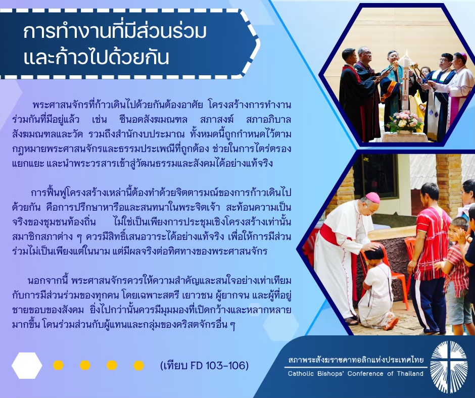 เพื่อพันธกิจการก้าวเดินไปด้วยกัน (Synodality) จะเกิดขึ้นจริงได้ ก็ต่อเมื่อประชากรของพระเจ้าทุกคนมีส่วนร่วมในกระบวนการตัดสินใจ ไม่ใช่เป็นของผู้นำฝ่ายเดียว แต่ทุกคนมีความรับผิดชอบร่วมกันตามพระพรและความสามารถที่ได้รับ